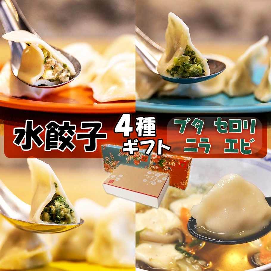 もちもち水餃子4種ギフト 各10個入り ブタ ニラ セロリ エビ 冷凍餃子 豚肉 野菜 家飲み 点心 肉汁 お取り寄せ グルメ 冷凍 お中元 おつまみ